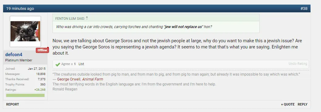 Then replace every instance of "Jews", "Jewish bankers" or anything like that with "Soros", and see how it looks to you. I think you'll see that it looks a whole lot like posts in this thread.
