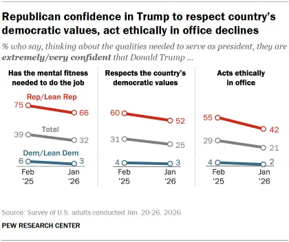 For example, 60% of Republicans said last February that they were extremely or very confident Trump respects the country’s democratic values – it’s 52% today. And while 66% of Republicans say he has the mental fitness to do the job, that’s down from three-quarters last year.