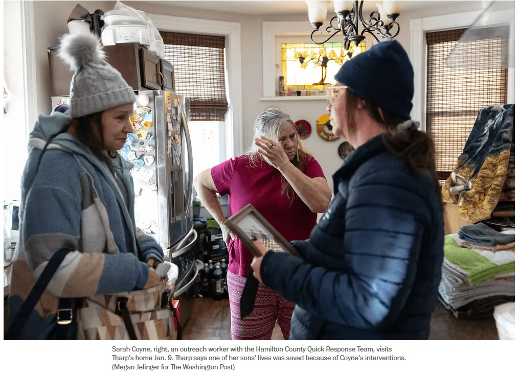 Each week, Coyne drops by the family’s home in the hardscrabble Price Hill neighborhood. She ferries Tharp’s 44-year-old daughter to receive medication that treats opioid addiction. Coyne has arranged many stays at hospitals and treatment centers for Tharp’s 39-year-old son — and revived him multiple times after finding him unconscious from overdoses.