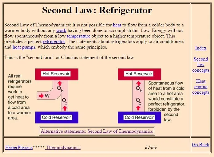 Second Law of Thermodynamics: It is not possible for heat to flow from a colder body to a warmer body without any work having been done to accomplish this flow. Energy will not flow spontaneously from a low temperature object to a higher temperature object.Below is a screen shot of the Georgia State University site that you referenced. I generally try not to be rude, but if you look at the picture you will find that what they are referring to isI didn't write it...it came from the physics department at Georgia State.