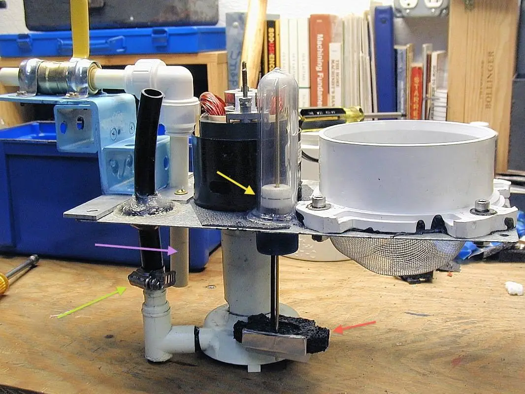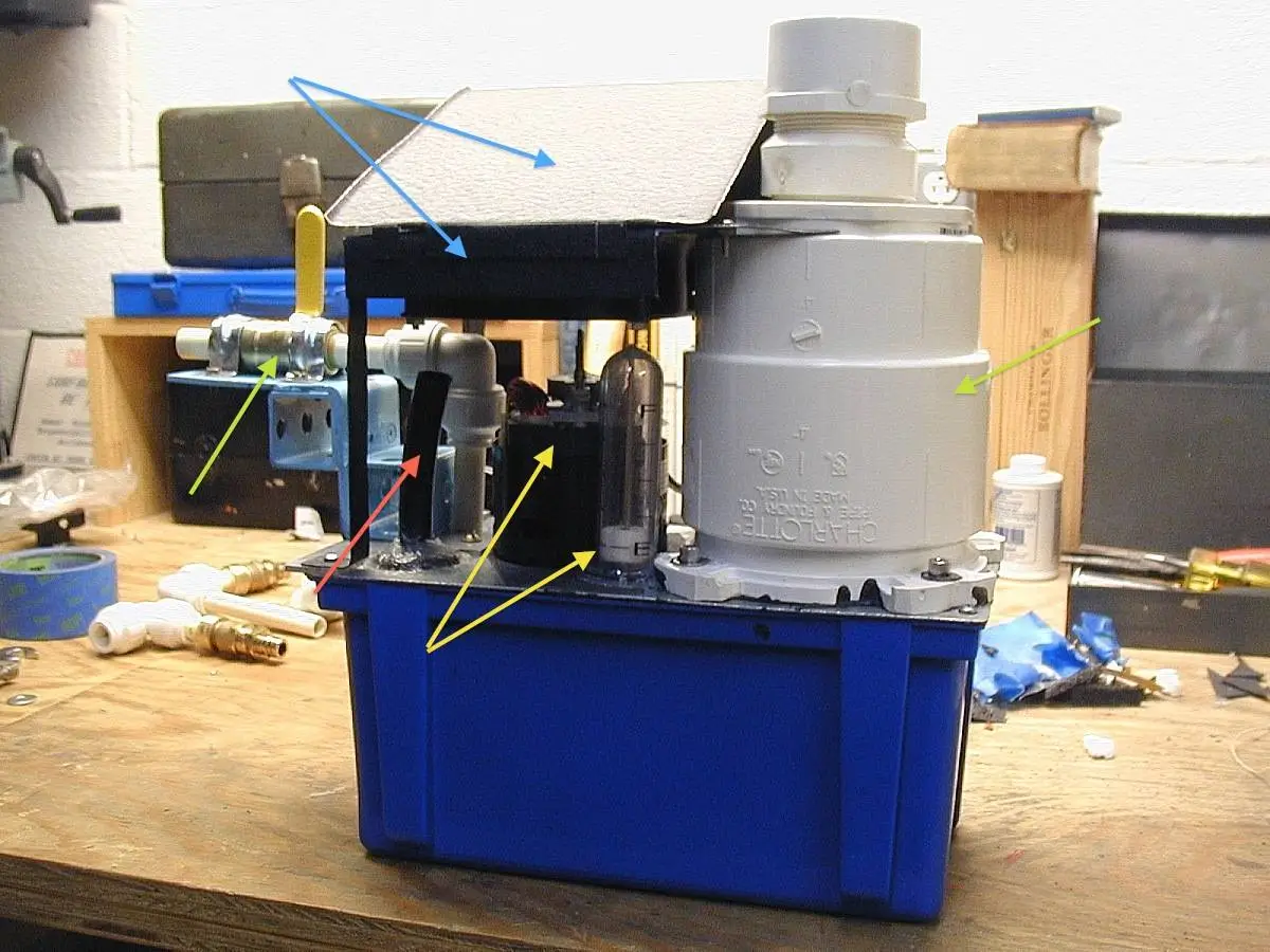 That connects to the output of the pump feeding the excess fluid back in a bypass return line to the tank only supplying the flow needed then for unrestricted spraying at the heads--- I find this way much easier on plumbing and the pump itself. Then I added a filtration system that catches chips in the return fluid stream, added a petcock to drain the tank, plus added a hood over the pump motor which holds a cooling fan with a slanted roof over it to keep any splashes from above being sucked into the motor, then finally added a float indicator made out of a test tube which gives a visual indication of the level of the fluid in the tank.