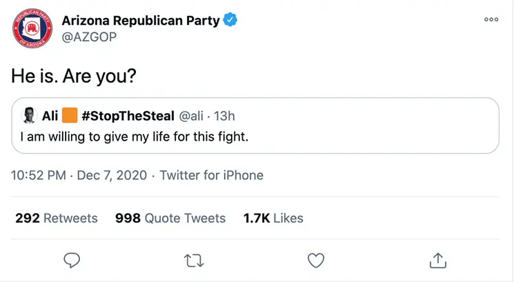 Arizona GOP asks followers if they're willing to die in effort to overturn election results
