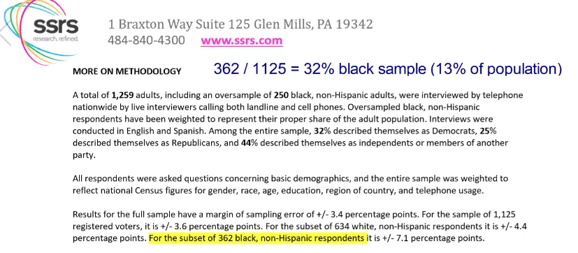 But here is the kicker. Even initially they said there were 250 black respondents, later below they say that were actually 362 (32%) blacks and 634 (56%) whites out of 1125 registered voters.