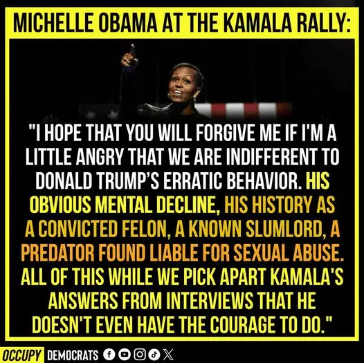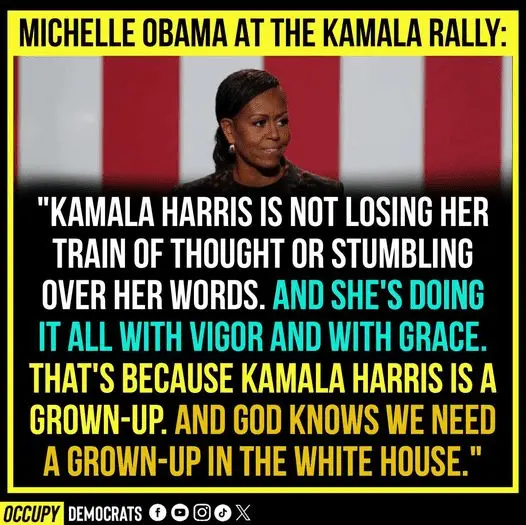 Too late to make up for her and Bidens failures now. Everyone knows the score, and she's now just a lost soul trying to separate herself from her and Joe Bidens puppeteering act or rather them being pimped out by their puppet master Obama. Michelle is just trying to mend the strings in so that they can get another 4 year's dangling those two upon those strings.