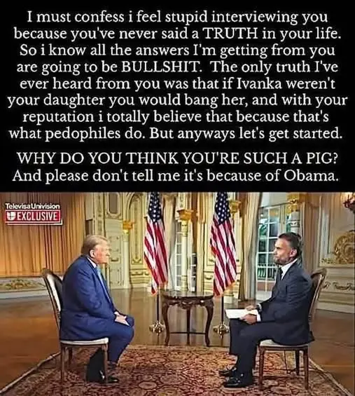 They love to insinuate or lie about what Trump says, otherwise just like the lie they fabricated about Trump telling people to try bleach during Covid or that Trump said to Putin in effect, "hey Putin if you have dirt on Hillary please give us a call", otherwise twisting it into him really saying "I Trump knew Putin had dirt on Hillary the entire time and proved so when I told him to give us a call" or the lie about Trump saying he'd bang his own daughter, and on and on and on the lies keep rolling off of their lips. Oh yeah, and what about that alledged lie Martha Raddits(?) either told or tried to manipulate him on, otherwise in hopes to get him to say something in that interview with 60 minute's that time ?? Can't remember exactly what the situation was, but Trump ended the interview with her or 60 minutes because of it.... Something about her being dishonest in the interview he felt ??And that is exactly what you parrots call an interview. Moron.