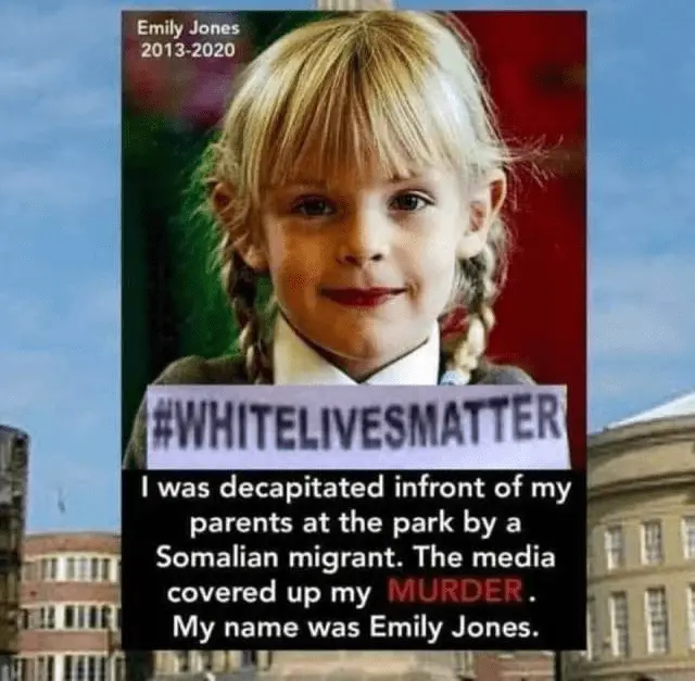 A number of posts shared widely across social media have falsely claimed seven-year-old British schoolgirl Emily Jones was killed by a Somali migrant, and her photo has been used to fuel a “White Lives Matter” campaign.