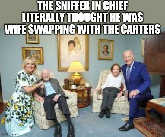 He looks like he's doing a ventriloquist act with Rosalynn Carter.That’s funny I wonder what he was sniffing to come to that conclusion or whether he will hold that thought long enough before he is distracted by something else...