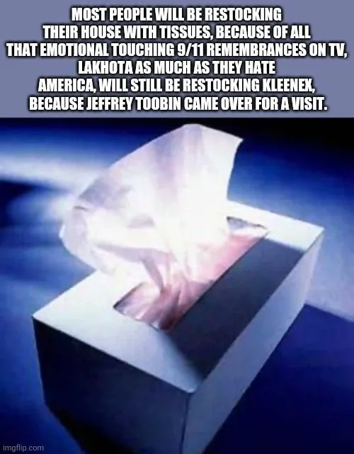 Wow Kleenex sure has morphed into many things since it was originally used an a “ cold creme remover” in 1924 and look nearly one hundred years later I am shocked and didn’t know it was being used for a “ hot creme remover” All I can say is LakHota has a great ability to take the most mundane political satire and twist it like the original use of Kleenex to whatever he likes
