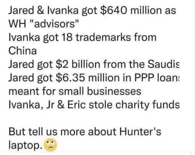 They always did business in other countries, but never because of Dad's political clout, because their dad was not yet a candidate and they never did it with gov't officials nor to sell out their country. But thanks for exposing your support of Hunter's deviant and treasonous behaviors and his Father's corruption that compromised our nation to CCP interests (which were tariff s and open borders to allow China fentanyl to flow through)- oops!