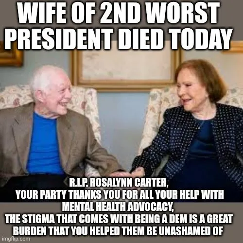 View attachment 860952Jimmy was always an enigma to me from farming peanuts to becoming the president of the United States he was a small nut to crack… Too me his failed policy with Iran and the rise of the mad mullah will always be placed at his feet and the failed attempt to free the hostages.. May his wife rest in peace and if anything can be garnered from his presidency it is that a chain or a country is only strongest as its weakest length…