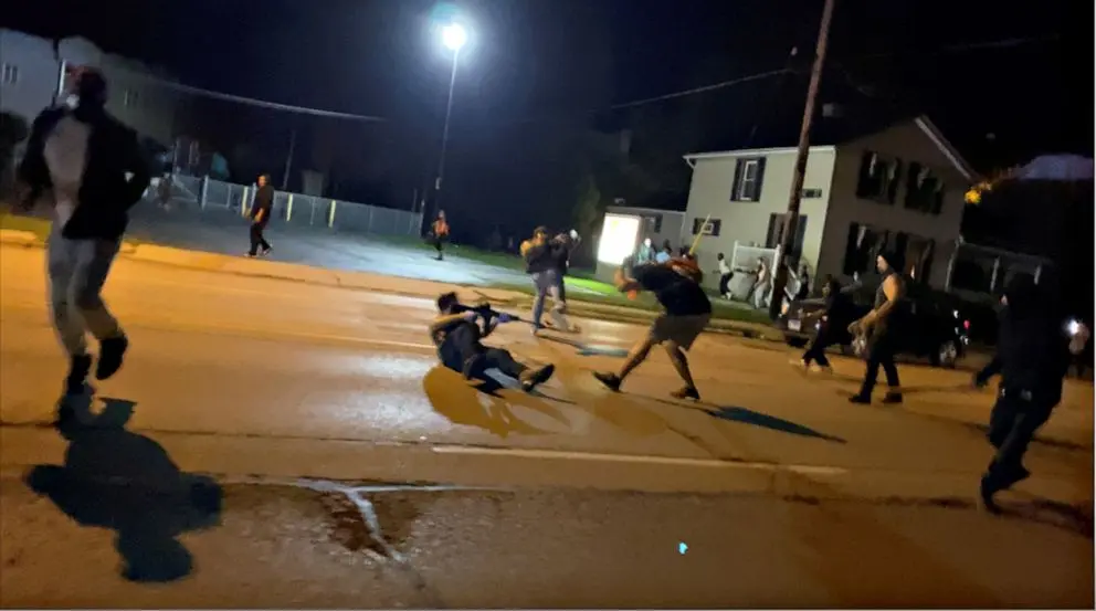 Rittenhouse on the ground, as the lefty antifa mob tries to close with him and kill him.
