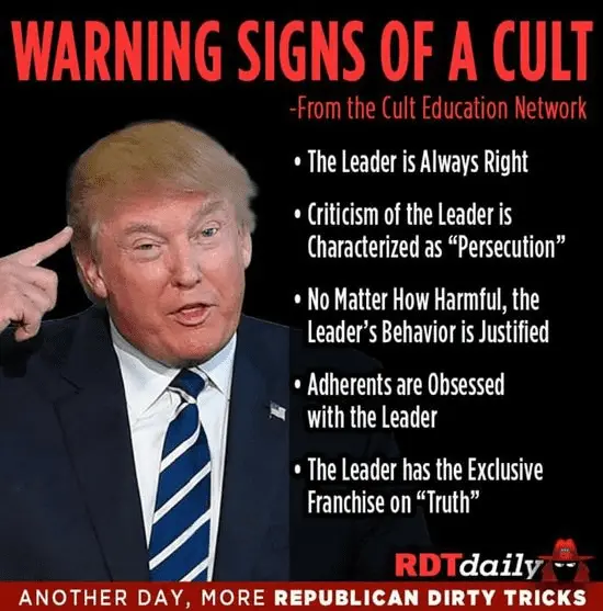 Cults, like the Jim Jones cult or Trump cult is based on a personality, as where the DNC is a cult like a Jehovah's Witness follows the Watchtower for talking points on how to think and behave. Both a cult. The only difference is following a person verses an organization.