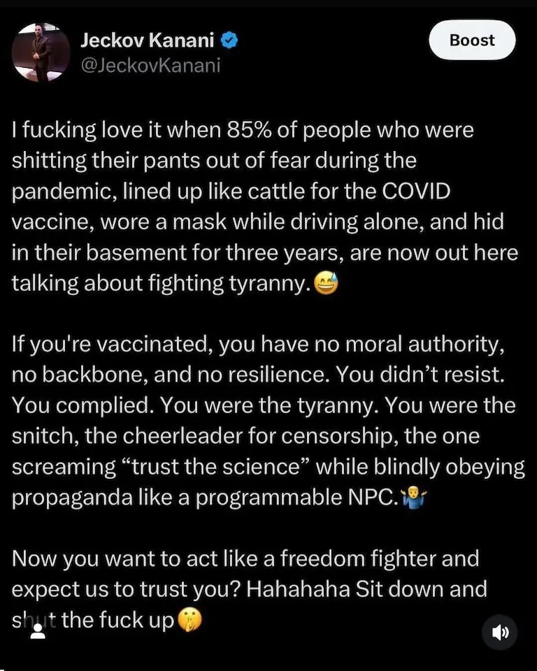 You libs have proven over and over again… you cannot properly identify fascism or authoritarianism. You never cried either when the crypt keeper was forcing people to take experimental medicine they didn’t want to take and was opening our border to the illiterate Third World against the will of the people.