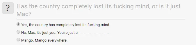 Poll is waaay too easy. trump is president so it is clear "the country has completely lost its ******* mind"