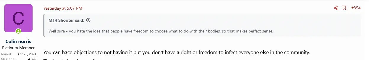 You don't remember telling us we do not have the freedom to not get the vaccine and infect everyone?Where did I say I object to your freedoms.