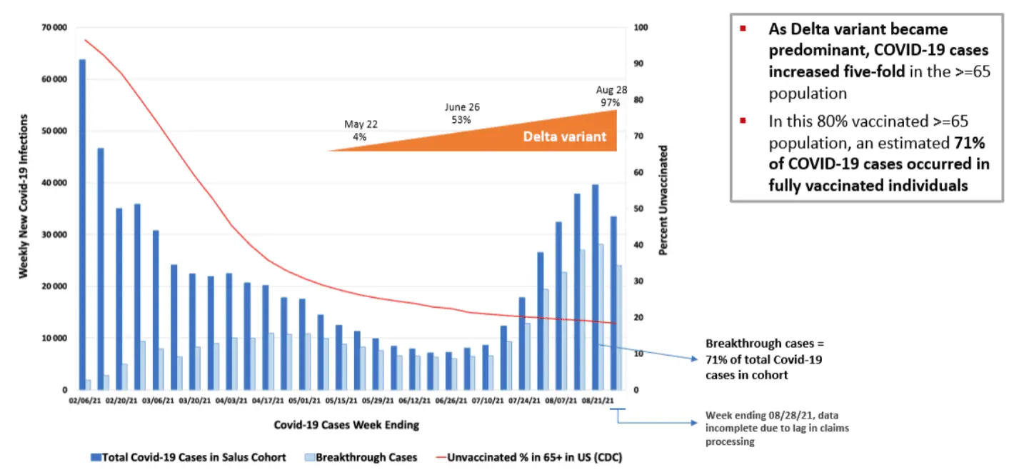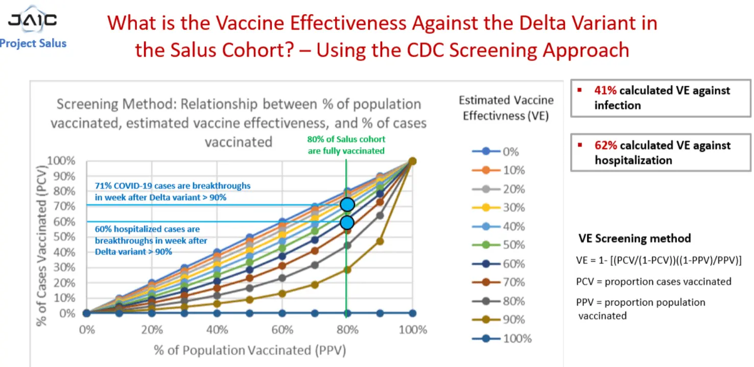 Slide 15: 71% and 60% respectively, when 80% are vaxed. So, vaccines have some effectiveness but wane over time. Not surprising.