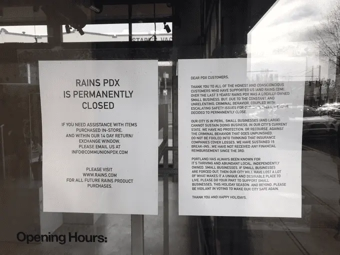 Portland, Oregon, clothing store Rains PDX shut down after facing more than a dozen break-ins and covering expensive repairs, according to a note posted the store's front door.