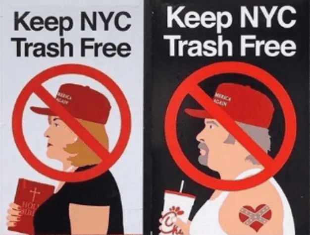 “These were not created or issued by the Department of Sanitation, and we do not condone the unlawful defacement of City litter baskets. We are looking into this matter,” the department said in a statement.