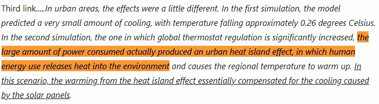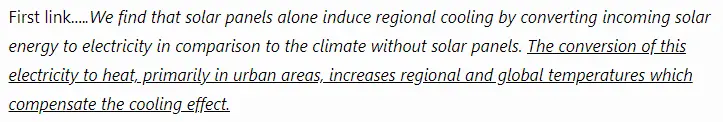 .....While the black surfaces of solar panels absorb most of the sunlight that reaches them, only a fraction (around 15 percent) of that incoming energy gets converted to electricity. The rest is returned to the environment as heat. The panels are usually much darker than the ground they cover, so a vast expanse of solar cells will absorb a lot of additional energy and emit it as heat, affecting the climate.