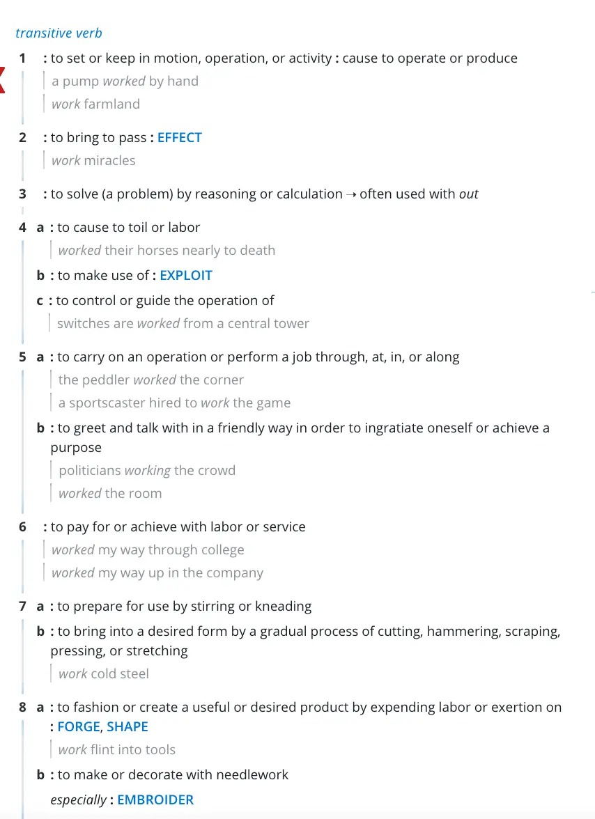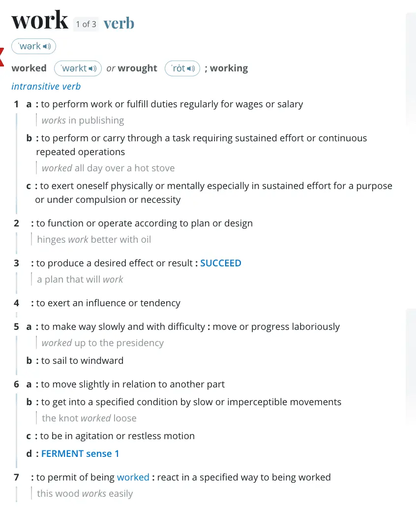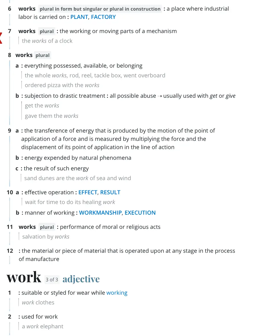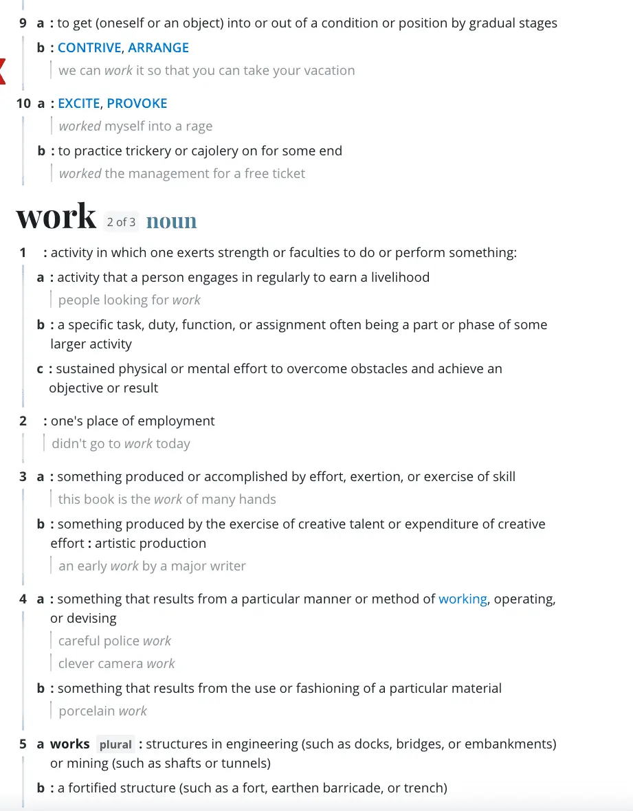 I must leave for a bit but I just asked Merriam-Webster to define WORK for me:
