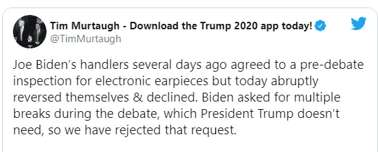 The Biden campaign has denied it ever agreed to such an inspection, and there is no evidence that Biden has ever used such a device during a debate. Tim Murtaugh, the Trump campaign's communications director, later said in a statement that Biden's team had agreed to an inspection and later backed out.