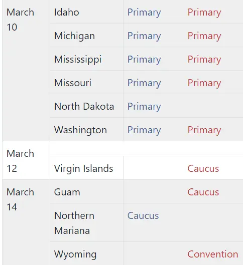 Below is the next round of things March 10-March 14, I have no immediate thoughts on any of the below States except that Biden will win Mississippi, North Dakota and possibly Missouri, no idea about Idaho or Wyoming, I would think Bernie might win Washington:
