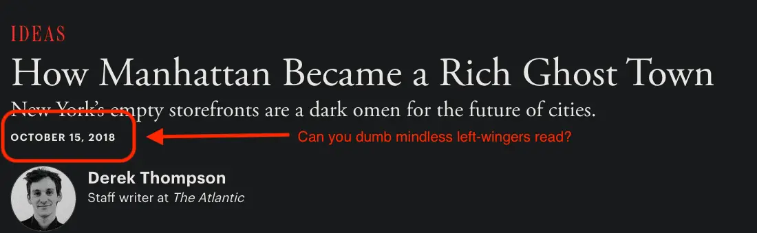 Nevertheless, only the dumbest of stupid women, who have not a single original thought in their head, would mindlessly conclude that reports of mass retail vacancy in NYC in 2018 and 2019, was do to covid in 2020.