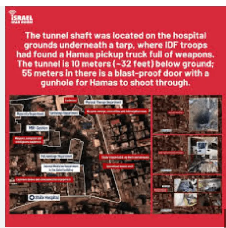Israel War Room on Instagram: "#BREAKING: IDF releases more evidence of Hamas tunnels underneath Shifa Hospital. This tunnel goes 10 meters (~32 feet) deep; 55 meters (~180 feet) in there is a blast-proof door with a firing hole in it. The tunnel was