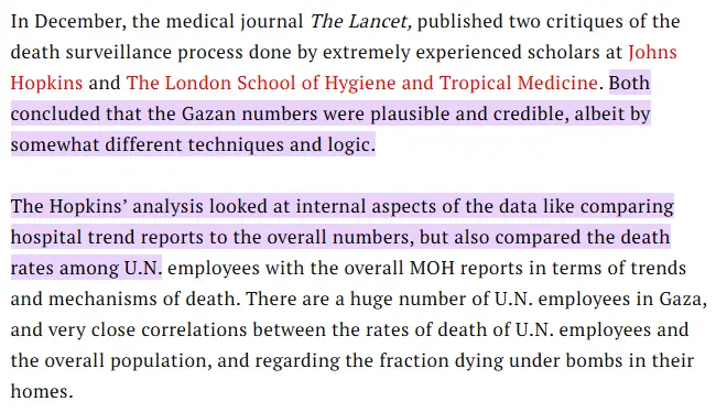 “The ebbs and flows of the bombings and attacks by Israel should cause the daily count to move together. But that is not what the data show. Not only is there not a positive correlation, there is a strong negative correlation, which makes no sense at all and establishes the third piece of evidence that the numbers are not real,” he notes.
