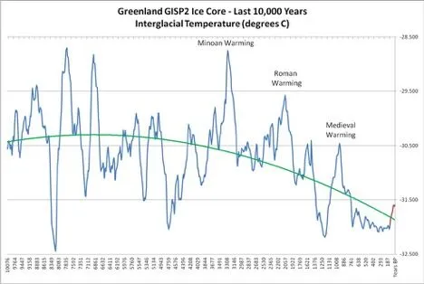 Here is the gold standard (according to climate science) GISP2 temperature reconstruction which shows temperature changes far greater, and far faster than anything we have seen. And do note that it is cooler now than it has been for most of the past 10,000 years. Keep in mind that this is n ice core taken above the arctic circle and reflects arctic temperatures. Ice cores taken in the Antarctic show a very similar record over the past 10,000 years and be reminded that climate science has stated clearly that the arctic regions are the canaries in the coal mine and what happens in those regions follows across the globe.