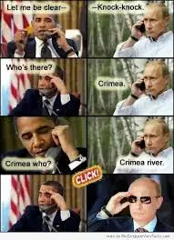 Didn't Obama just applied sanctions against Russia? Punishing Putin without firing a single bullet. Putin can't do a darn thing which makes him look like clown and *****.