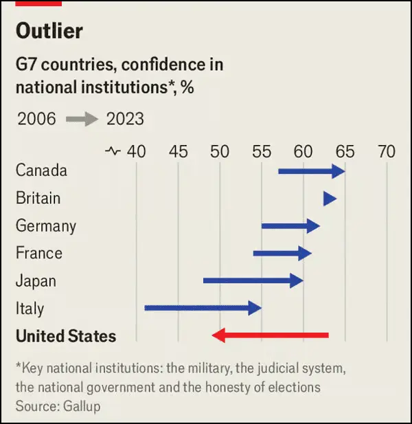 This week the Economist wrote about the way American trust in institutions has collapsed over the past couple of decades. This is not news. However, this is a very interesting comparison: Collapse of trust in government is a purely American phenomenon. Why? Because we have Fox News and the...