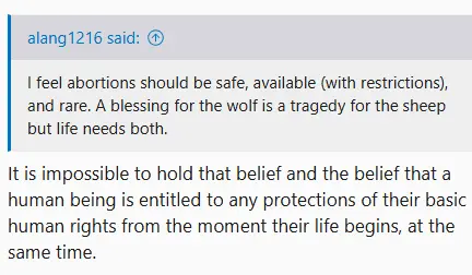I it not impossible, it is not even difficult, because, unlike you, I make a distinction between a sack of DNA (a fertilized egg) and a recognizable human with senses and a brain. That sheep has legal rights, it can't be mistreated by people, but it's right to life doesn't protect it from wolf's right to kill it.It is impossible to hold that belief and the belief that a human being is entitled to any protections of their basic human rights from the moment their life begins, at the same time.