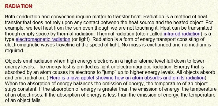 All objects absorb and emit radiation. ( Here is a java applet showing how an atom absorbs and emits radiation) When the absorption of energy balances the emission of energy, the temperature of an object stays constant. If the absorption of energy is greater than the emission of energy, the temperature of an object rises. If the absorption of energy is less than the emission of energy, the temperature of an object falls.