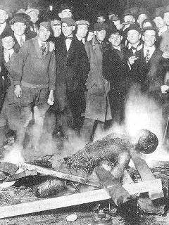 Often the lynch mob acted with haste, but on other occasions the lynching was a long-drawn out affair with speeches, food-eating, and, unfortunately, ritualistic and sadistic torture: victims were dragged behind cars, pierced with knives, burned with hot irons or blowtorches, had their fingers and toes cut off, had their eyes cut out, and were castrated -- all before being hanged or burned to death. One Mississippi newspaper referred to these gruesome acts as "Negro barbeques." 4
