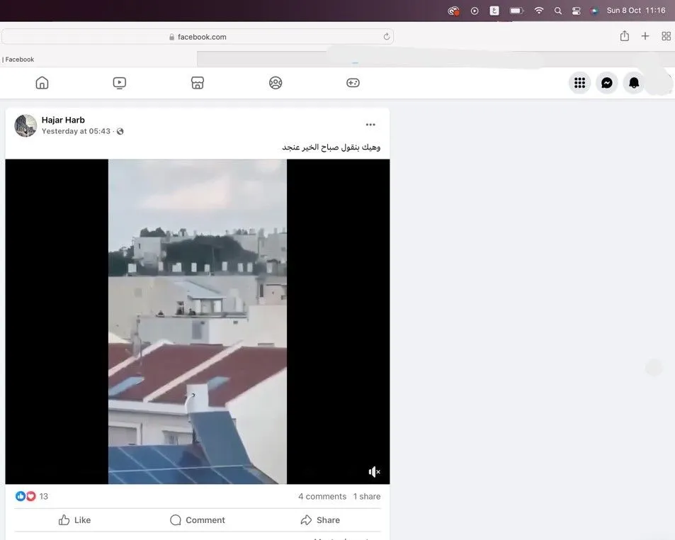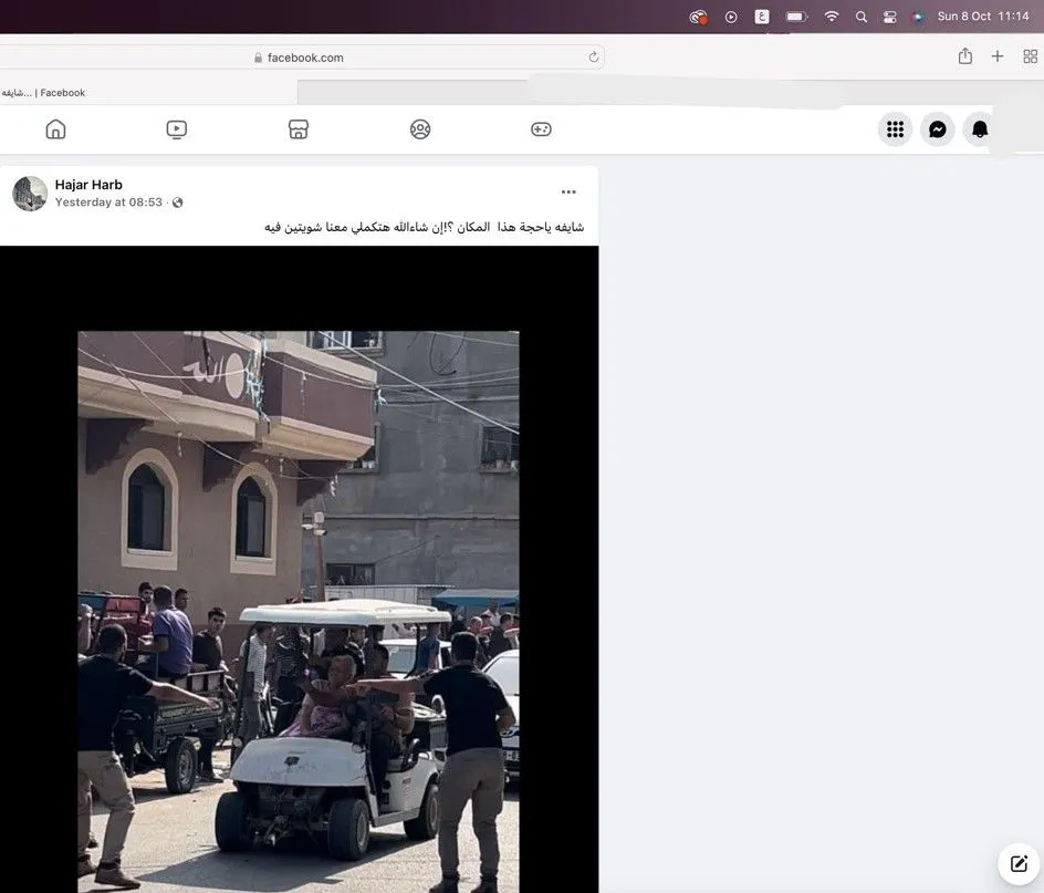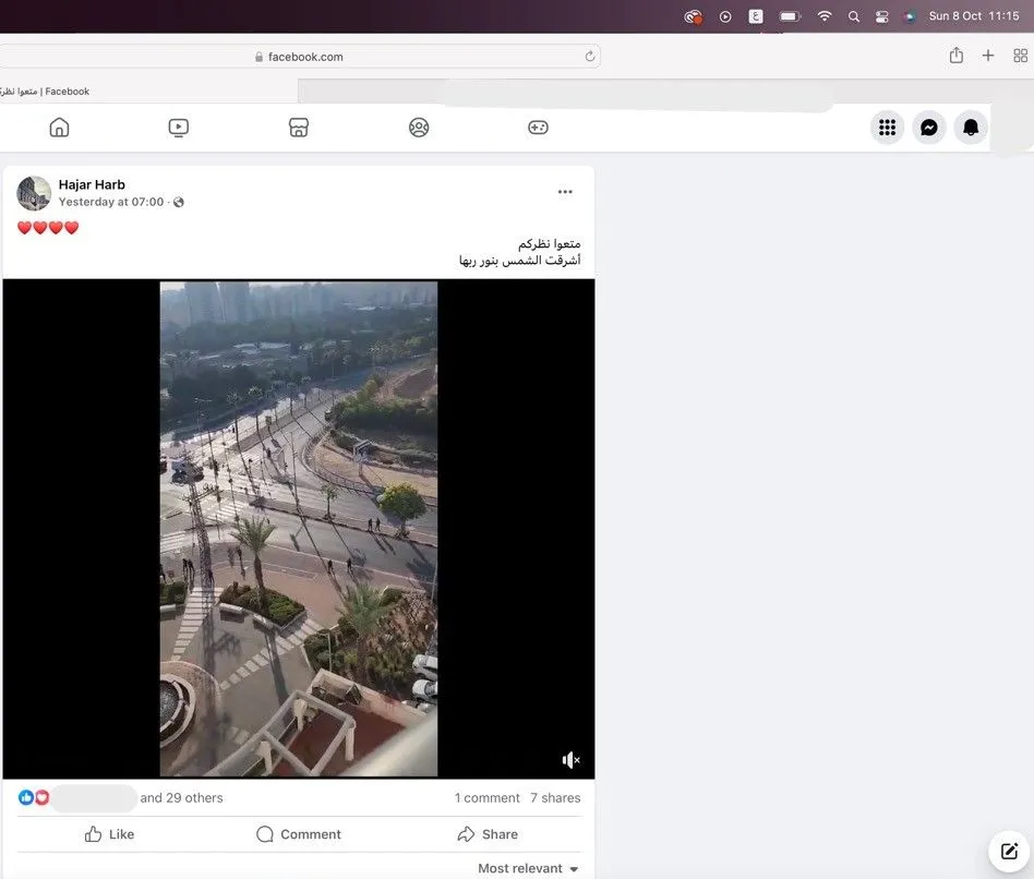 In the following screenshot from Harb’s Facebook profile, the Washington Post contributor mocks Shiri, Ariel and Kfir Bibas with an image of the kidnapping of the young family by Hamas. She writes in Arabic: “Enter [captivity] off the right foot, sister. Instead of anything [like that] she goes ‘I want my children’, ‘I want my children’, go ahead, [this is] your home and your spot, you and your children.”