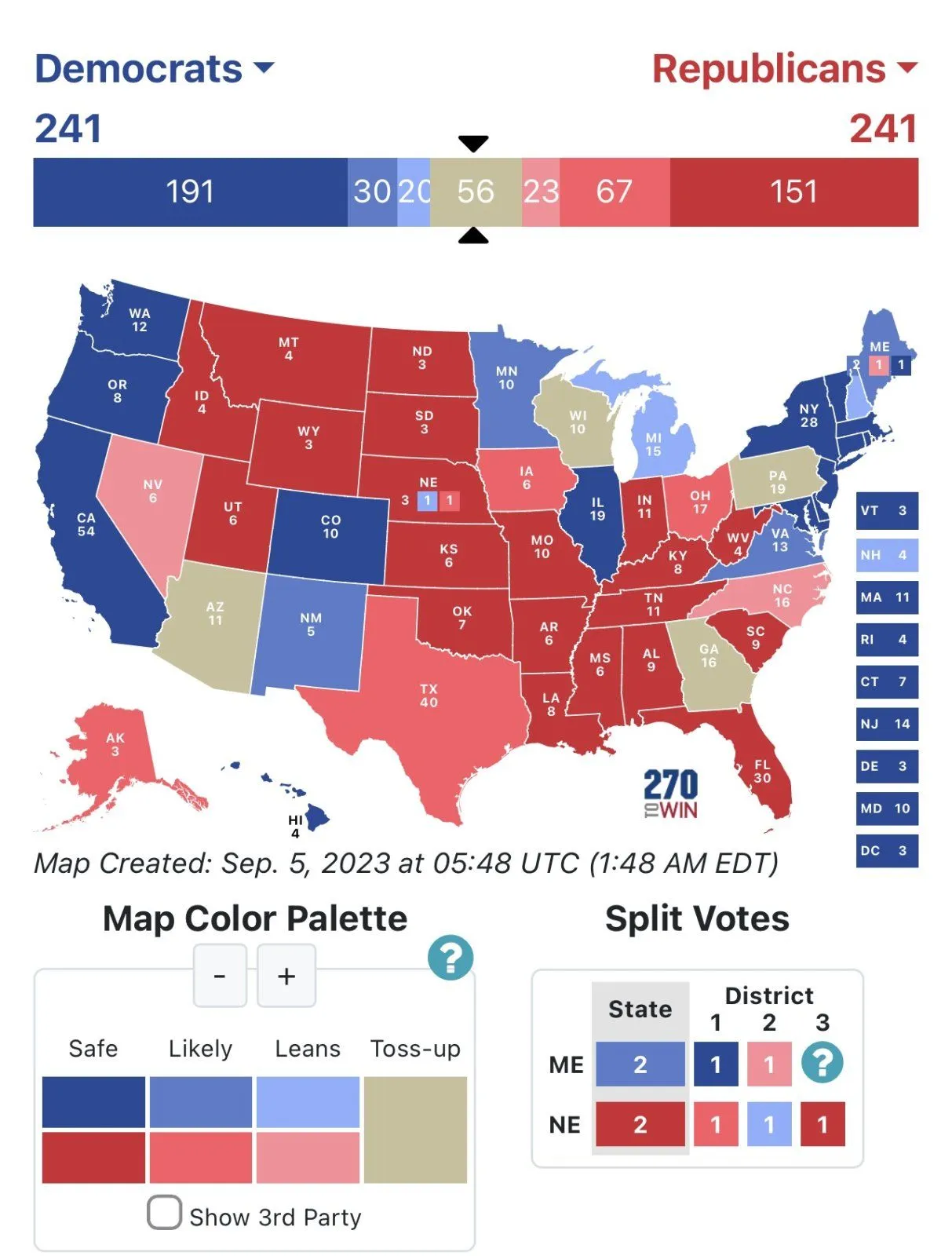 Each side needs the same. Thirty Electoral votes to win in this scenario. That means Pennsylvania and Georgia become basically must win States. If you lose Pennsylvania you have to pick up Arizona and Wisconsin to make up the difference. If you lose Georgia and either Wisconsin or Arizona you are done.