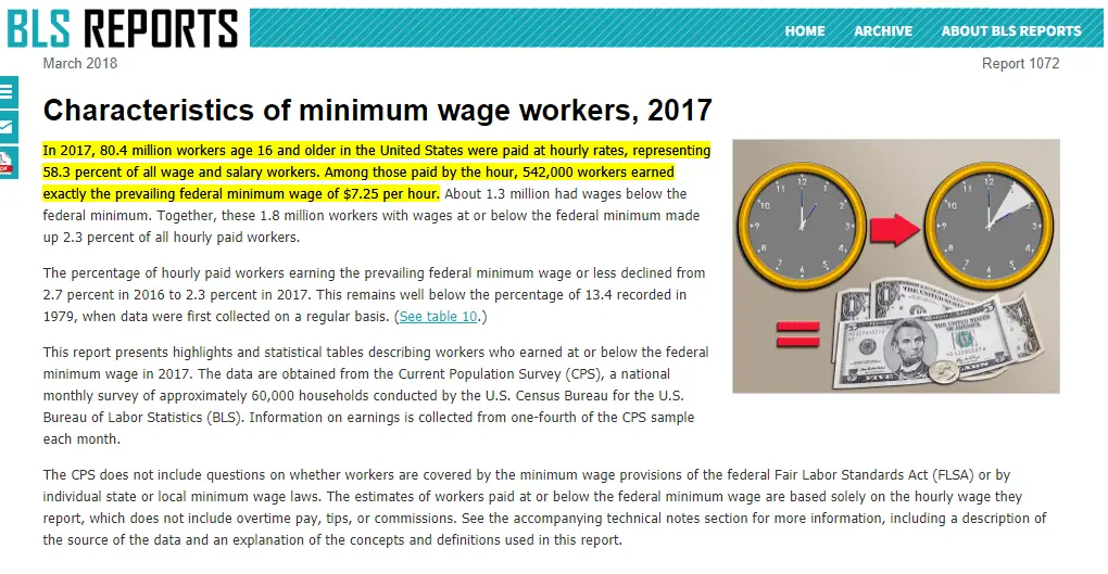 In 2017, 80.4 million workers age 16 and older in the United States were paid at hourly rates, representing 58.3 percent of all wage and salary workers. Among those paid by the hour, 542,000 workers earned exactly the prevailing federal minimum wage of $7.25 per hour. About 1.3 million had wages...www.bls.gov