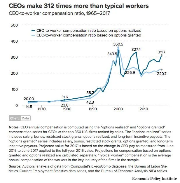 Statistics show that over the last 30 years executive pay skyrocketed while worker pay has been stagnant