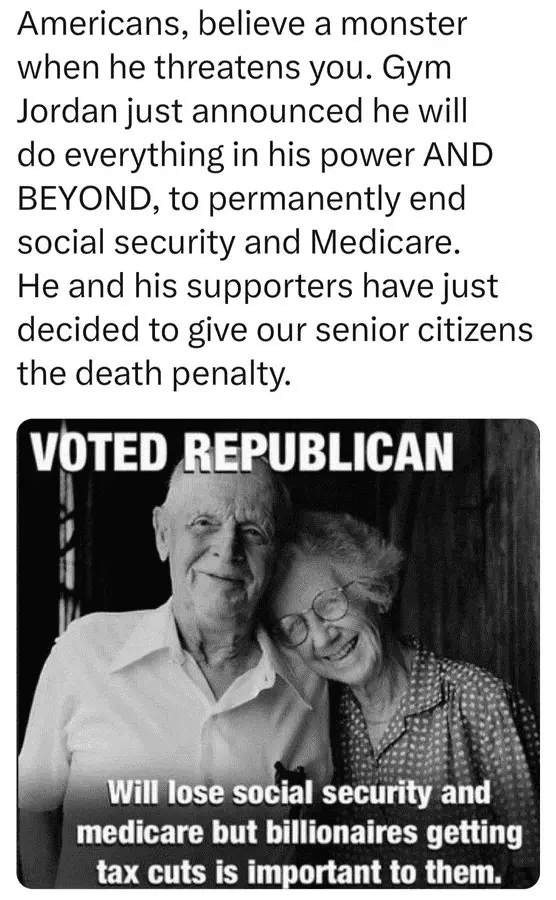 You're an idiot that believes anything they are told. Link where Jordan said he would end social security.jknowgood supports Gym Jordan's desire to eliminate social security and medicare.