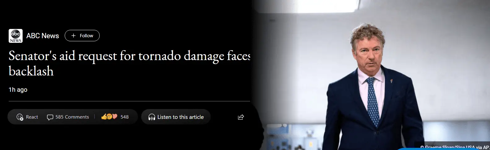 I have relatives in Kentucky. Those tornadoes did great damage. But Rand Paul who opposed disaster relief for other states now begs for it.