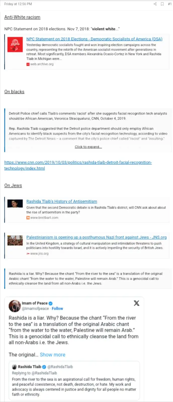 I find it both odd and disturbing that the number one issue this woman advocates for is the plight of a foreign people against a long-time American ally. She has also purported to advocate for other “Palestinian”-Americans. But WTF is THAT, really? She was not elected to represent Gaza or the West Bank. Moreover, her constituency consists of more than “Palestinian”-Americans.