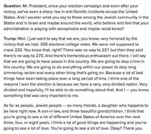 Of course you thought it was well said . He didn't answer the question and went into his bullshit answer about winning the election. Nothing about antisemitism or his xenophobia.,