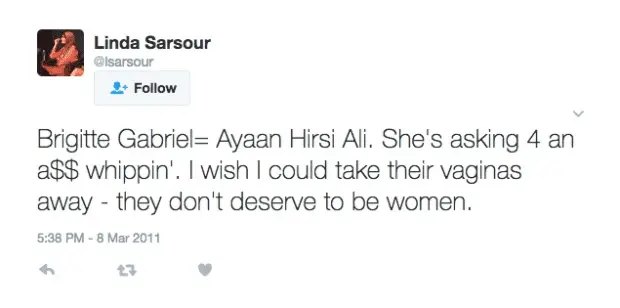 Sarsour’s enjoying some extra celebrity lately thanks to her role in organizing the Women’s March. And with good reason. After all, her feminist credentials are exemplary. Just look at this [since deleted] 2013 tweet about women’s rights activists Brigitte Gabriel and Ayaan Hirsi Ali: