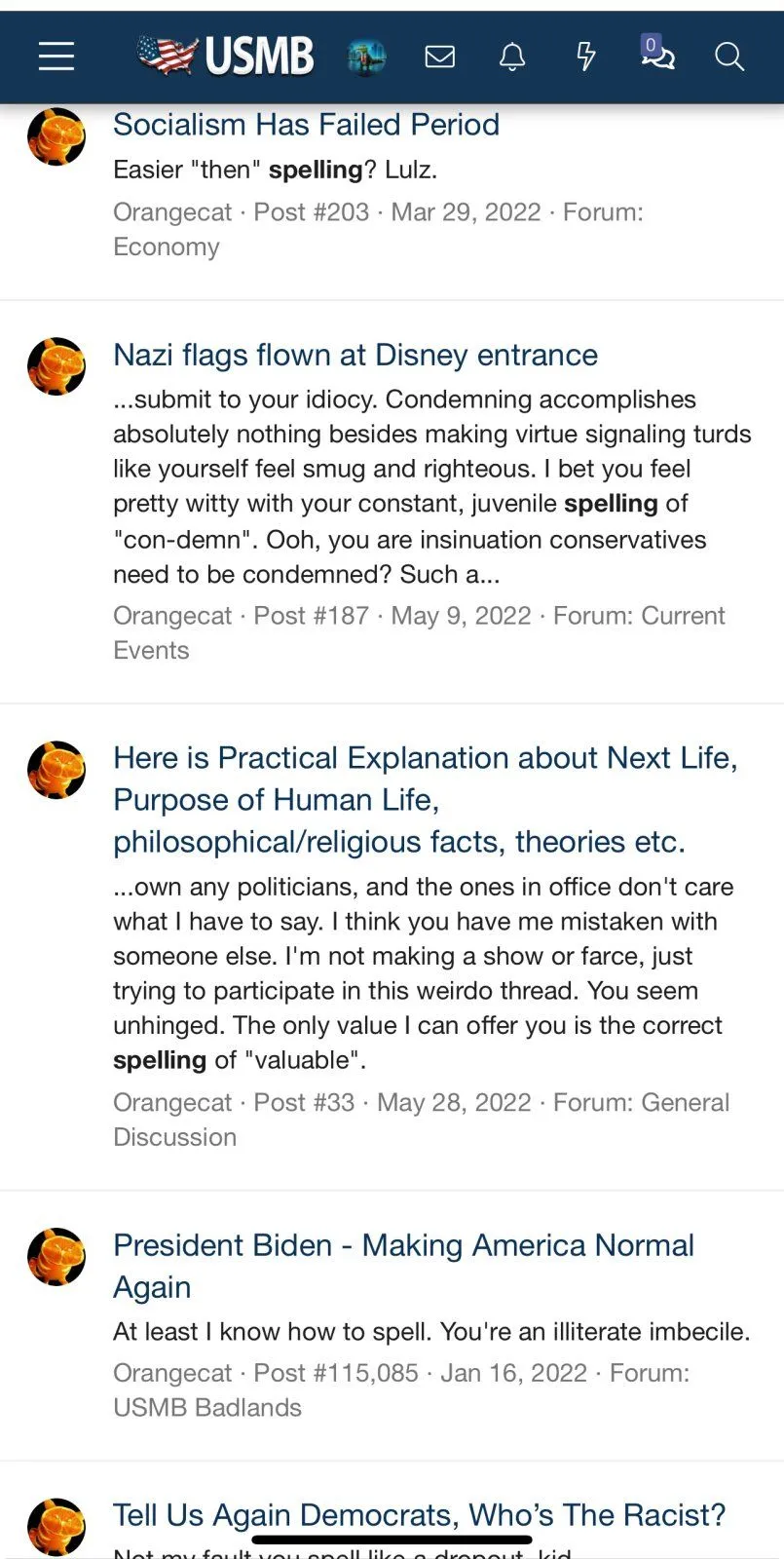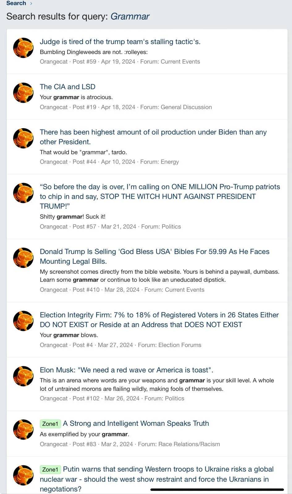 Search “grammar” keyword and posts by “orangecat” and you’ll get over 100 posts of you making grammar callouts.. on the internet…with people on their phones. That is just the few where you actually typed the word grammar. There are hundreds more.