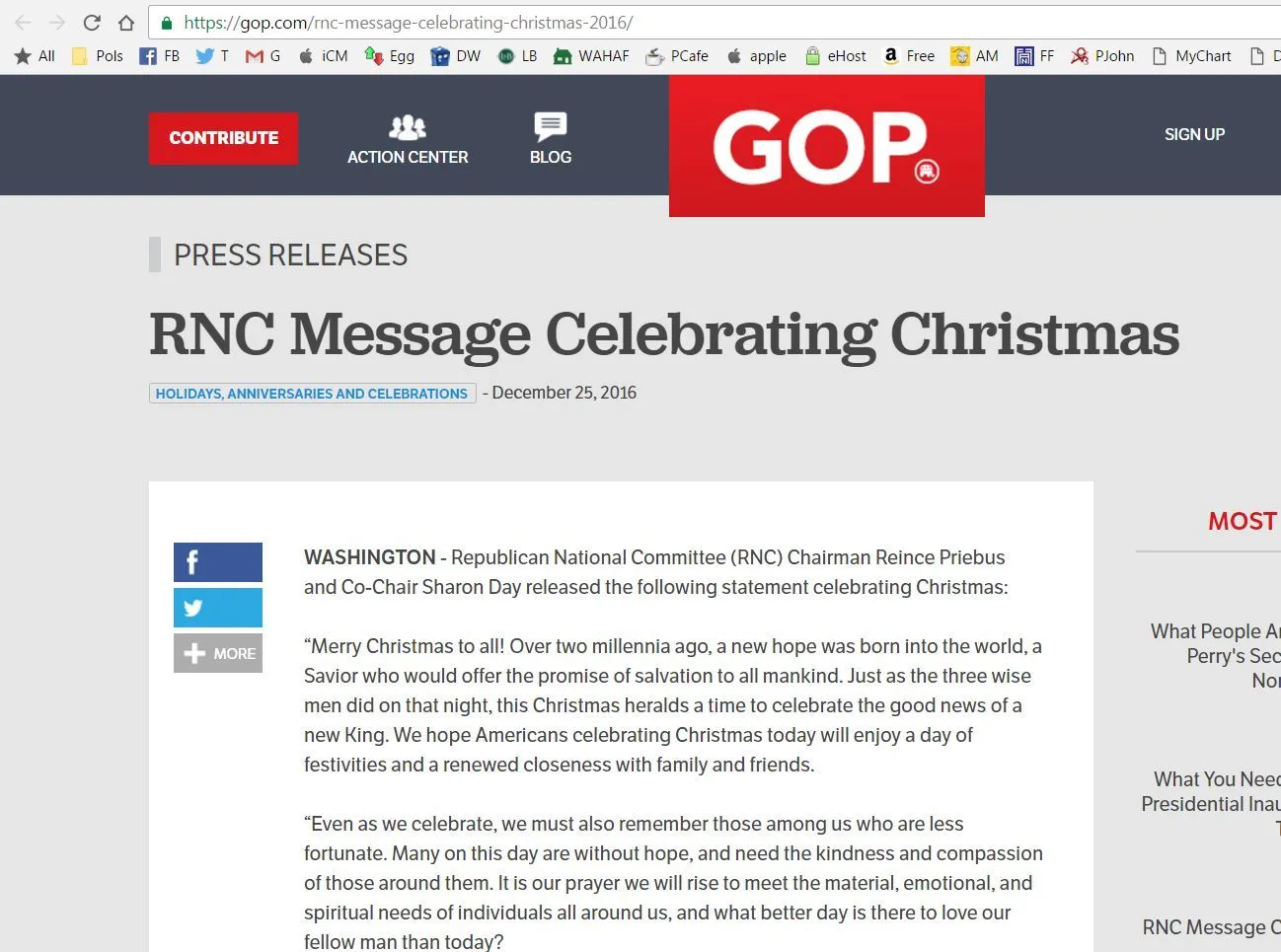 WASHINGTON - Republican National Committee (RNC) Chairman Reince Priebus and Co-Chair Sharon Day released the following statement celebrating Christmas: