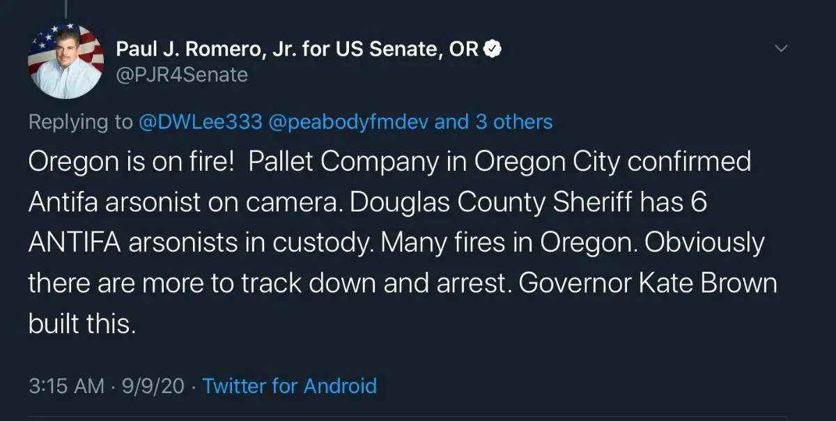 False claims that antifascists are starting forest fires have been spread by supporters of President Donald Trump.