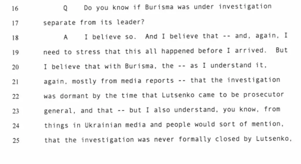 During the impeachment hearings, many witnesses were questioned about their knowledge of the Biden-Burisma connection, and the firm's reputation in Ukraine. Former U.S. Ambassador to Ukraine Marie Yovanovitch, during House testimony last year, said she didn't have much knowledge about the firm, and noted that she only learned of its connection to Biden through "press reports" she read while preparing for her Senate confirmation hearing.“Burisma wasn’t a big issue in the fall … of 2016, when I arrived,” she said, noting that the investigation and details surrounding its closure “happened before I arrived.”"It was not a focus of what I was doing in that six-month period," she said.
