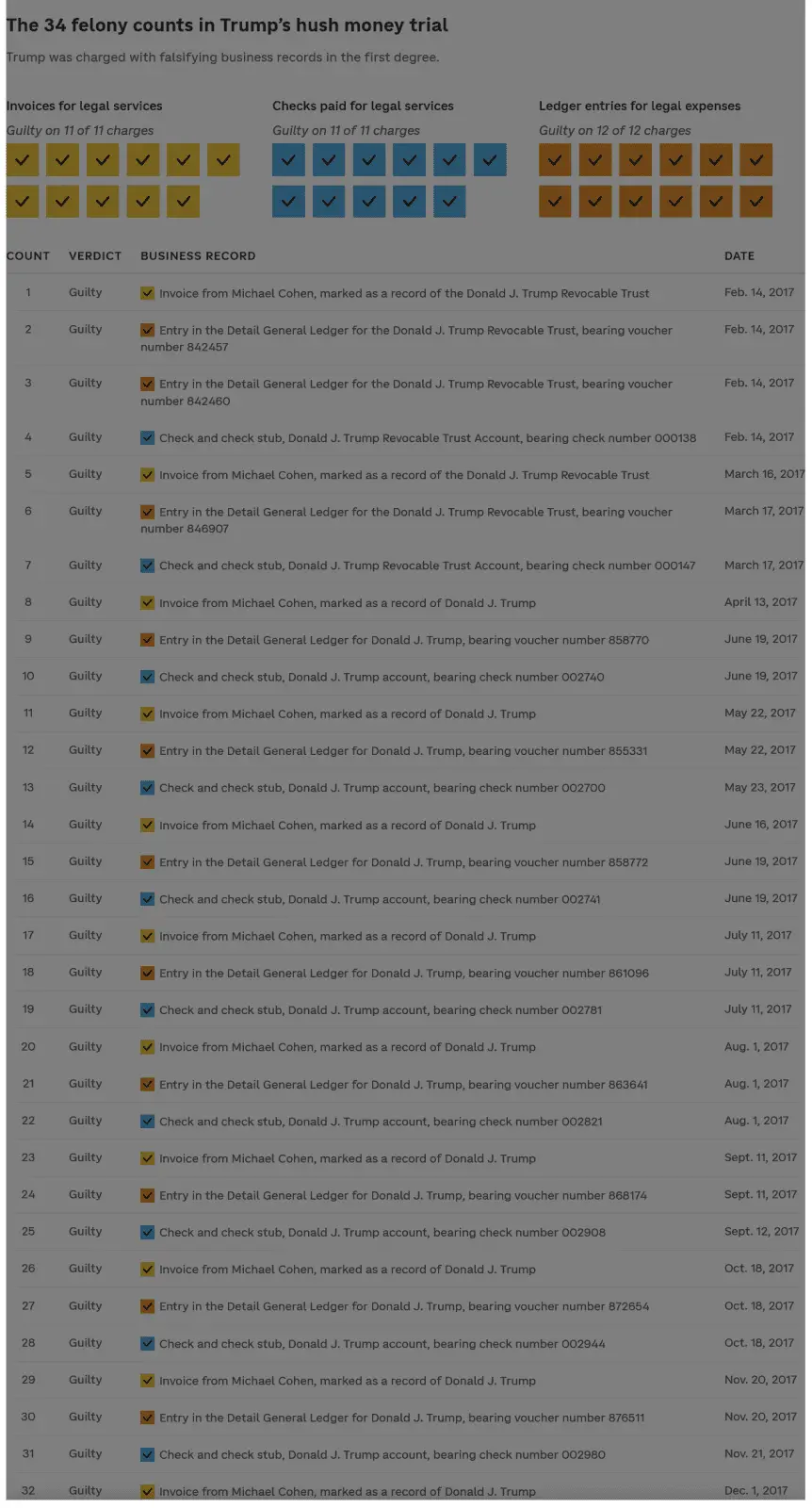 Jurors in the New York criminal trial against former President Donald Trump have convicted him of 34 felony counts of falsified business records.