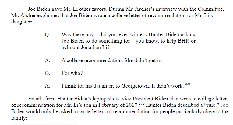 As Vice President, Joe Biden also wrote letters of recommendation for Jonathan Li’s son and daughter, according to testimony from Hunter’s former business partner, Devon Archer, and emails found on Hunter Biden’s laptop.